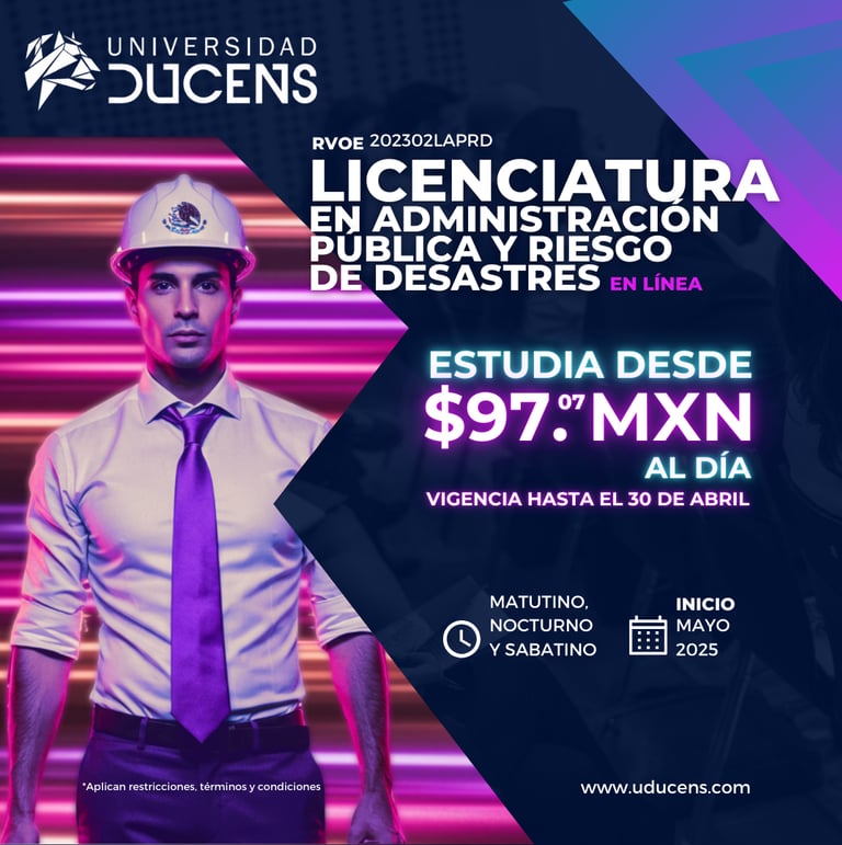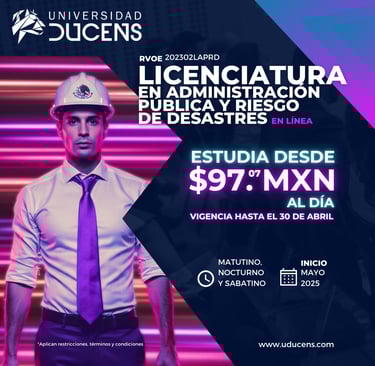 ¡Forma parte de la primer generación de nuestra destacada Licenciatura en Administración Pública y Riesgo de Desastres! Te ofrecemos un paquete completo que incluye tu primera colegiatura al 50% de descuento (Precio regular $5,824.00 MXN), inscripción a Ducens (precio regular de $1,000.00 MXN) e inscripción SEP (precio regular de $250.00 MXN). Es valido hasta el 30 de abril, podrás disfrutar de nuestro precio promocional todo por $2,912.00 MXN. No dejes pasar esta oportunidad única. Las clases comienzan en mayo de 2025. Esta es tu oportunidad para dar el siguiente paso en tu carrera profesional.