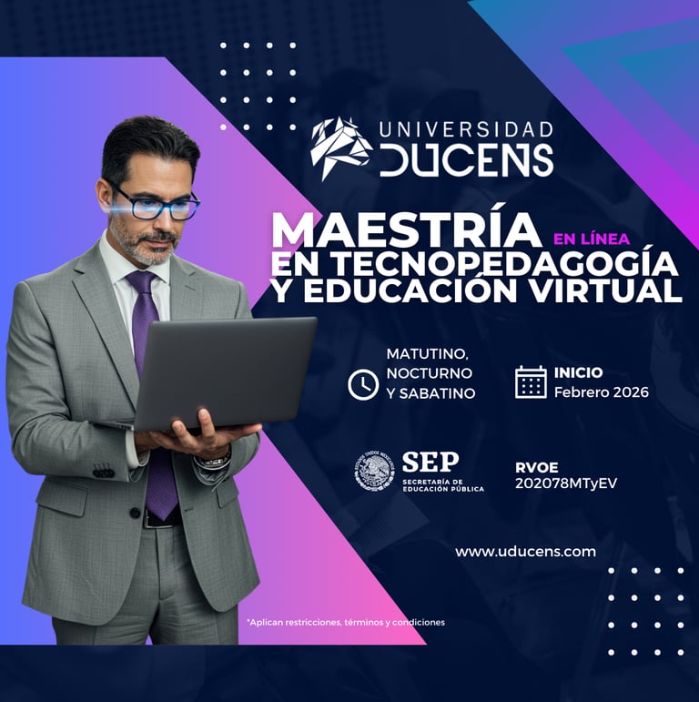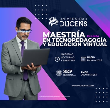 ¡Forma parte de la primer generación de nuestra destacada Maestría en Tecnopedagogía y Educación Virtual! Te ofrecemos un paquete completo que incluye tu primera colegiatura al 50% de descuento (Precio regular $5,824.00 MXN), inscripción a Ducens (precio regular de $1,000.00 MXN) e inscripción SEP (precio regular de $250.00 MXN). Es valido hasta el 31 de enero, podrás disfrutar de nuestro precio promocional todo por $2,912.00 MXN. No dejes pasar esta oportunidad única. Las clases comienzan en febrero de 2026. Esta es tu oportunidad para dar el siguiente paso en tu carrera profesional.